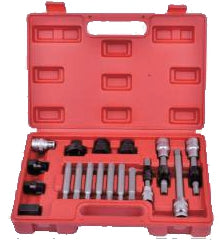 Kit contains 18pcs screwdriver bits and sockets for installing & removing alternator pulleys.