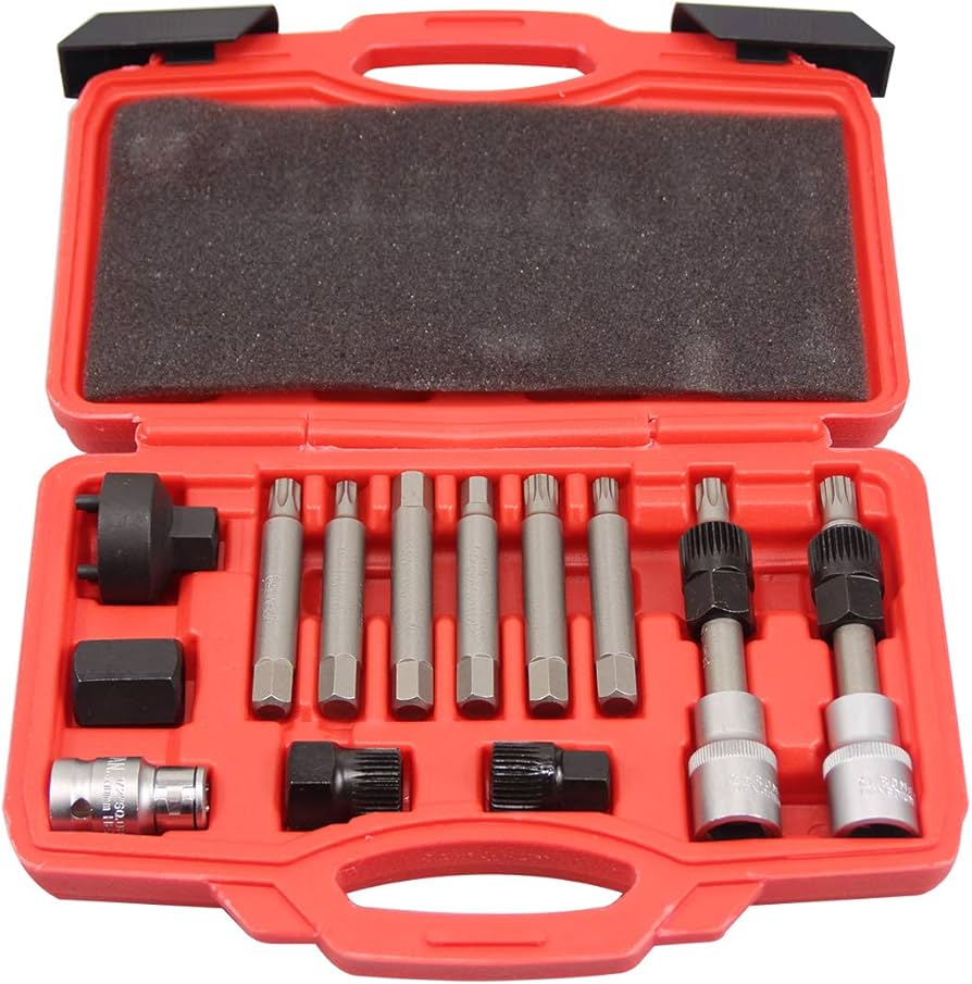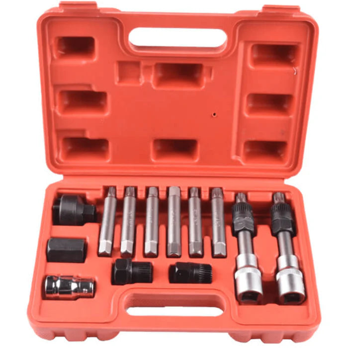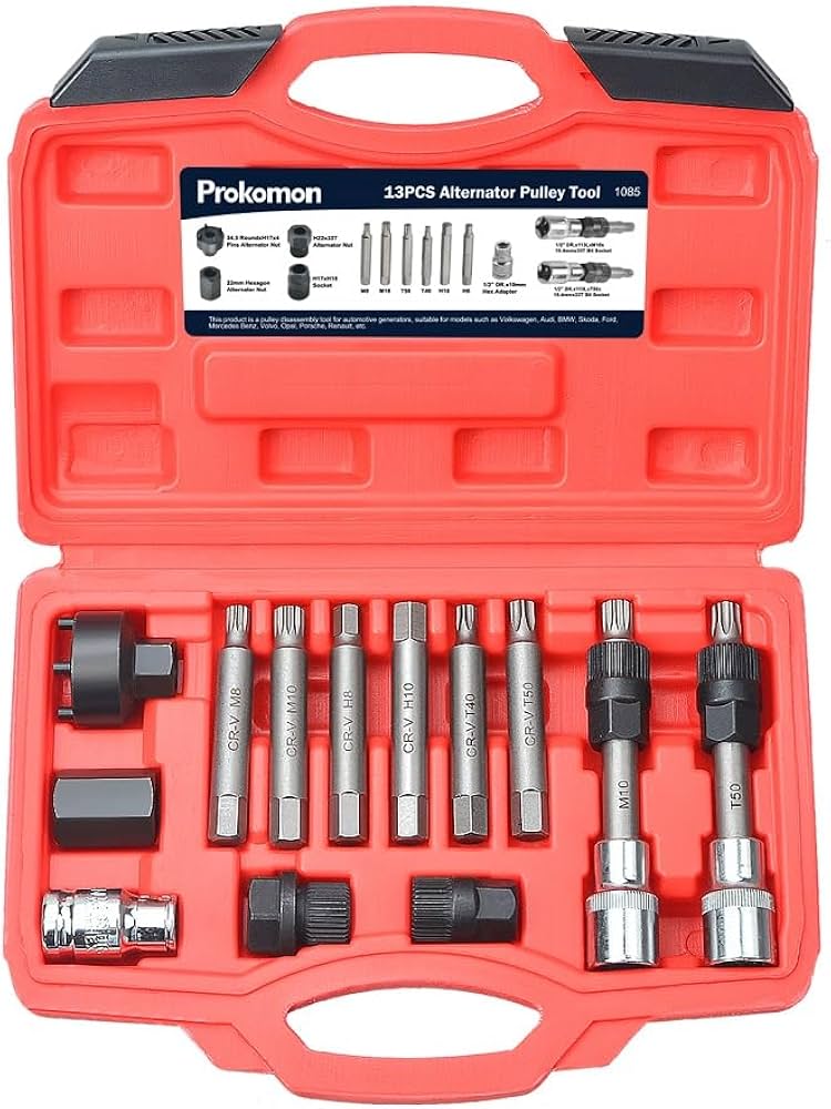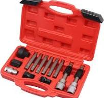 Alternator pulley tool kit permits easy removal of freewheel alternator, either on or off the vehicle, making simple work of alternator removal and installation jobs.