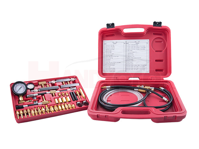 The fuel injection test kit tests fuel injection system on vehicles on most makes and models. Pinpoints problems in filters, lines and regulators. The kit comes complete with assorted hoses, hose barb fittings and hose clamps to adapt to earlier vehicle models, as well as current. The adapter set tests fuel injection systems on vehicles on most makes and models: