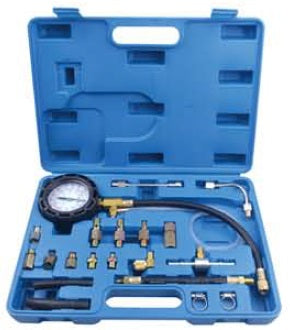 High pressure fuel injection test kit, rubber enclosed gauge 0-145psi (0-1000kPa) with assorted fittings for various petrol vehicles.
