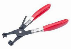 For removing and installing flat band hose clamps in hard to pump on reach areas.