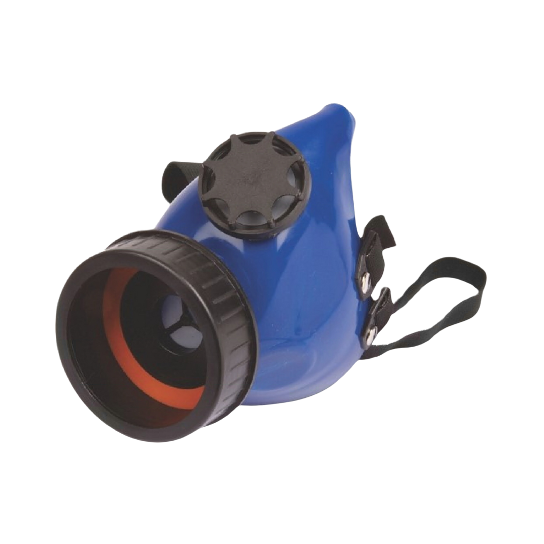 Single half mask, soft plastic body covers nose and mouth.
