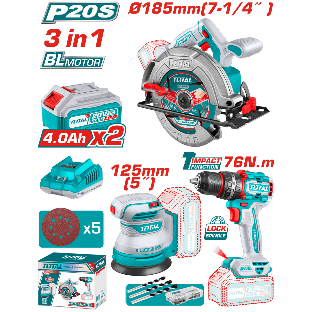 TOTAL 20V COMBO 3PC Drill 76nm+C/Saw185+Sander,2x4AH – TOSLI250181